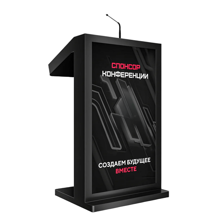 Мультимедийное решение, которое позволяет не только ярко выступить на большую аудиторию, с отображением презентационного материала, но и эффектно продемонстрировать рекламную информацию о компании, предлагаемых товарах / услугах, спикере, на большом внешнем дисплее трибуны. Модель Double 19" оснащена мощным микрофоном, сенсорным дисплеем для спикера, а также большим внешним дисплеем для рекламного контента и набором разъемов для подключения дополнительной техники. Такая трибуна станет прекрасным помощником на конференциях, выставках, спортивных мероприятиях или других мероприятиях, где требуется визуальная поддержка презентаций и общение с аудиторией.